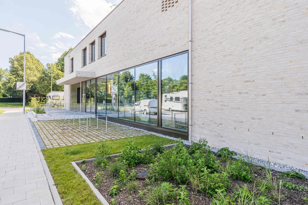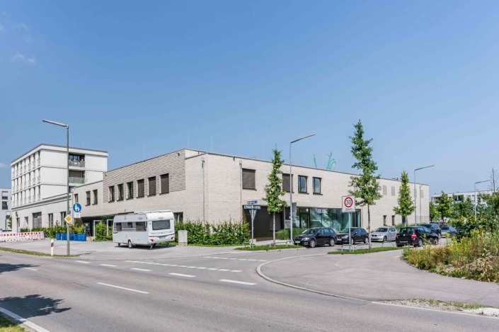 In Ramersdorf bei München entstand ein knapp 7.000 m³ fassender Massivbau mit Verblendmauerwerk-Fassade, der eine Kinderbetreuung und eine offene Einrichtung für Heranwachsende und Jugendliche beherbergt. Zu den charakteristischsten Details des L-förmigen Gebäudes zählt zum einen das Obergeschoss des Kinderhauses, das ohne Stützen um rund 6,5 m über den darunterliegenden Parkplatz auskragt. Zum anderen die große gläserne Panoramafassade des Jugendcafés. Der Entwurf stammt von den Münchener Asböck Architekten, die Übersetzung in eine detaillierte Tragwerksplanung lieferte LEICHT.